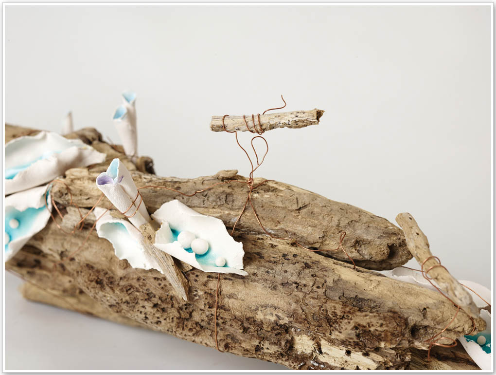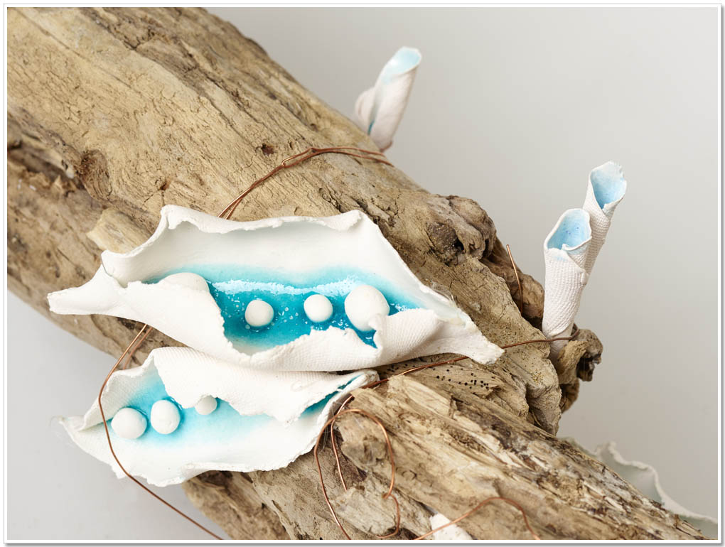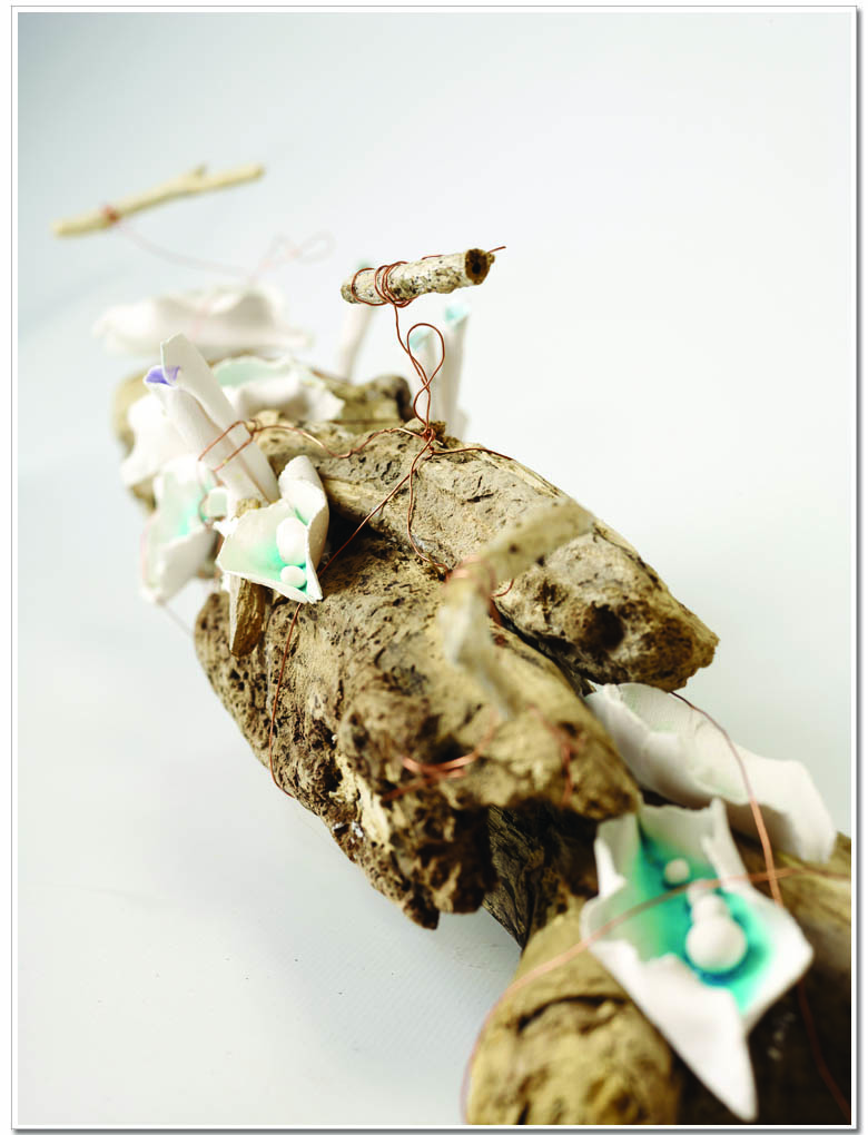 (ingrandisci) "Nature Revolution" La forza del Mare dona la vita ad un ramo reso arido dalle sue stesse onde. La Natura con altrettanto vigore esplode, crea fiori e baccelli, dipinge il tutto "di mare" e genera una "rivoluzione". Emanuela Battista (Dimensioni: A 25 L 100 P 15 / Tecnica: installazione di paperclay 1.200 gradi, cristallina con ossidi su base in legno marino naturale)